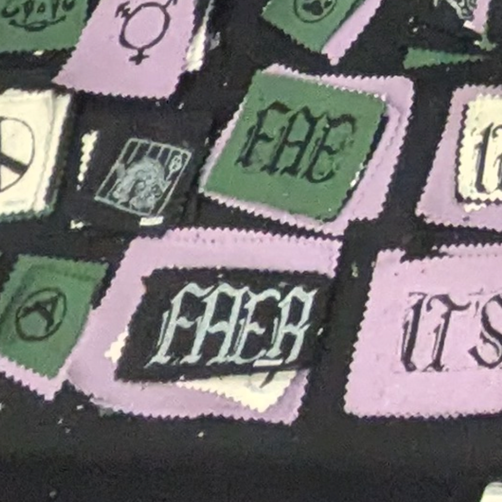 Lino cut and hand printed "faer" pronoun patch in an olde English font design on a small patch .