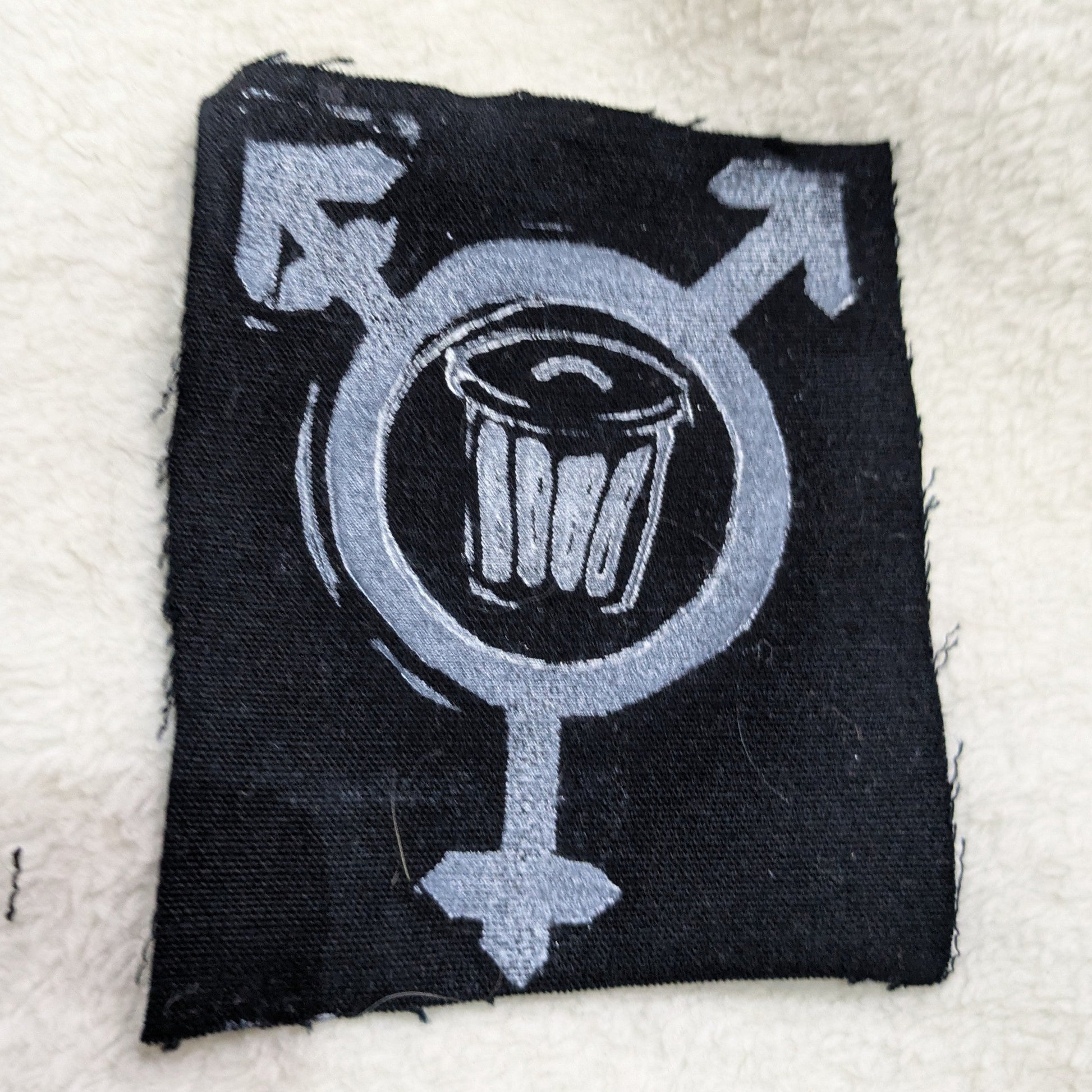 Lino cut and hand printed transgender symbol with trash design in the center on a medium patch .